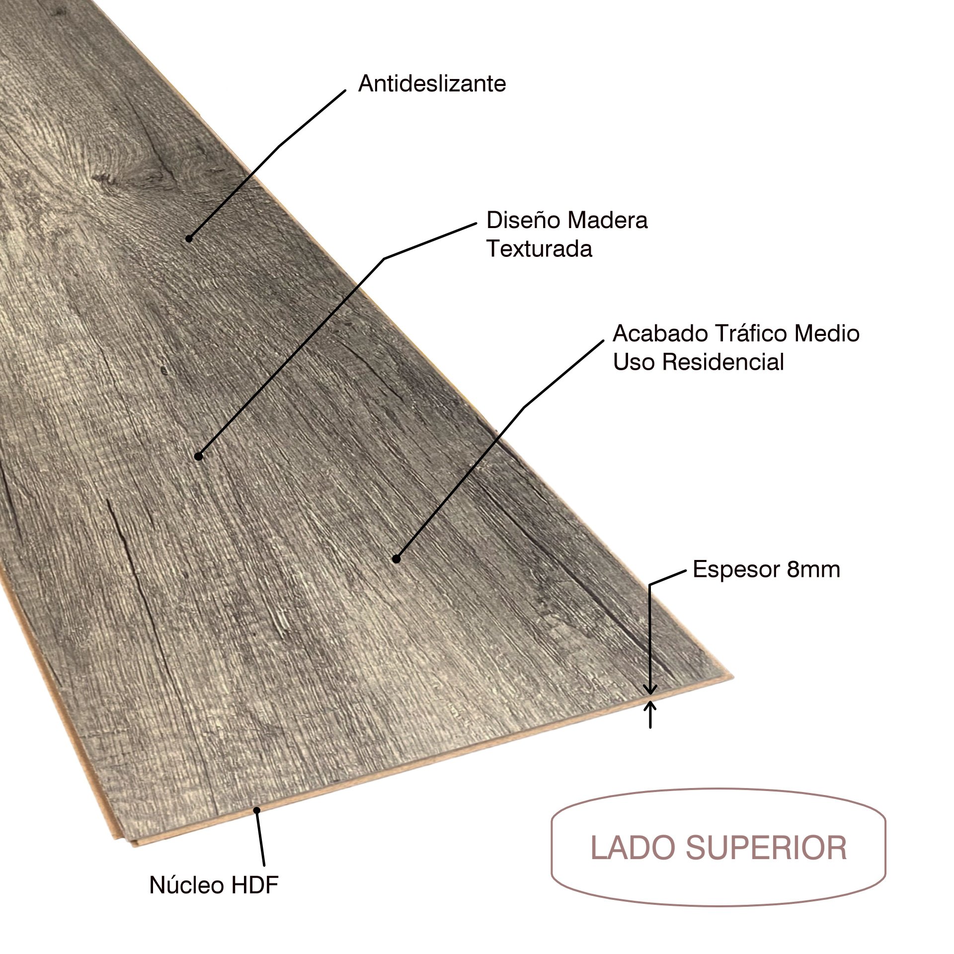 Piso laminado flotante Beste Boden de tráfico medio, texturado superficial de madera, espesor de 8mm y reforzado con placa estructural Black Seal, para una resistencia superior, impermeabilidad y anclaje sobre la espuma niveladora. Presentación en caja de 1,96 m2.